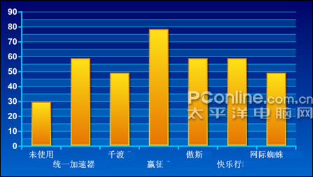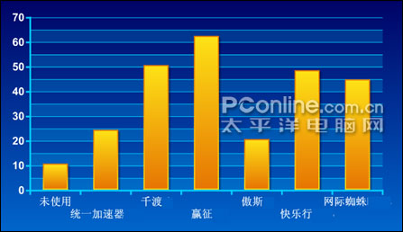 七、评测总结 以上我们对六款网通、电信互访加速软件进行了全面的测试,怎么样,读者朋友们是否找到了自己的所爱呢? 总的来说"千渡"、"赢征网关"整体表现比较好,在文件下载速度和文件传输速度两方面都表现除比较强劲的性能,此外,"赢征网关"在未网络游戏加速方面表现也不错。 与其他软件相比,这是其特色所在;而"统一加速器"、"傲斯加速器"相对来说要稍逊一筹,但是在稳定性和内存占用方面都让大家还可以接受;"快乐行"虽然速度提升也不错,但是由于稳定性不是很好,因此位居三线; 而"网际蜘蛛"占用内存最大,而且已经开始收费了,估计相当大一部分用户不会选择这个软件了,当然,付费后的网际蜘蛛可能在某些功能会有所提升,毕竟我们使用的是测试服务器,肯定很多功能不尽完善!