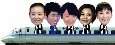 董洁、窦骁、周冬雨、殷桃和李小冉(从左至右)等“乘”和谐号为春晚开场。
