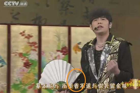周杰伦在唱《兰亭序》时用扇子表演了一个小魔术,没想到这个魔术却穿帮了,他打开手里的扇子时,扇面是白的,上面什么都没有,然后当他第二次打开扇子时,扇面上却多了水墨画。但是从截图上可以很明显地看出,他其实只打开了扇子的一半,当他打开空白的扇子时,有画的那一半是收在一侧的,那么当他打开有画的扇子时,空白的那一半又变成了收在一侧。