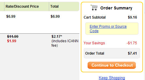 大家知道,使用目前.com最优惠的续费优惠码也需要每年7.99+0.18=8.17美元,而现在仅须7.41美元,节约0.76美元,还是非常值得的,呵呵。如果能有30%的优惠码,则更能把价格控制在7.06美元,非常超值的。