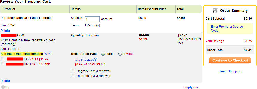 其实,Personal Calendar是神马东东QQPCC并不清楚,反正根本没有打算用它。购买这个商品后,所提示我们有一个1.99美元域名的优惠,经分析发现,这个优惠不仅能用于新注册,还能用于域名的续费和转移。