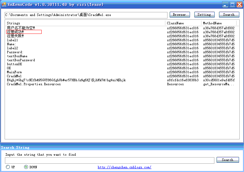 2、使用EnXenoCode打开这个CrackMe,再点击搜索就可以找出所有的被加密后字符串,如图所示: