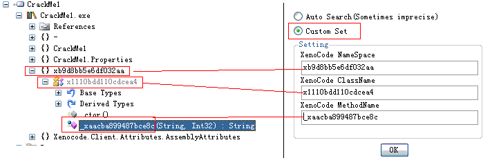 注意:如果有时提示无法找到方法名的错误,那么需要你进行手动进行设置,填入通过Reflector查看解密字符串处的namespace和类名、方法名。如图: