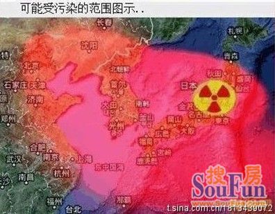 日本核扩散网上流传的中国可能受到核辐射的范围示意图