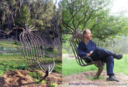 这是世界上第一把用活树做成的椅子,很可能也是唯一一把,这位澳大利亚的老人就是它的设计师。从种下树苗到长成椅子雏型,一共花费了7年的时间,这期间,设计师不断改善他的设计方案,以适应树木的生长情况,到现在,这把叫做Pooktre椅子已经12岁了。。。。