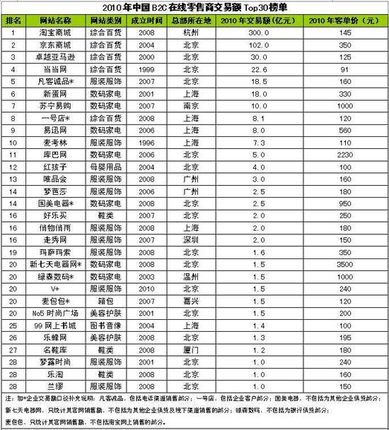 网易科技讯 4月13日消息 艾瑞发布2010年中国B2C在线零售商Top30榜单,其中淘宝商城以300亿交易额居首,京东商城以102亿元年交易额位居第二,卓越亚马逊30亿元居第三。
