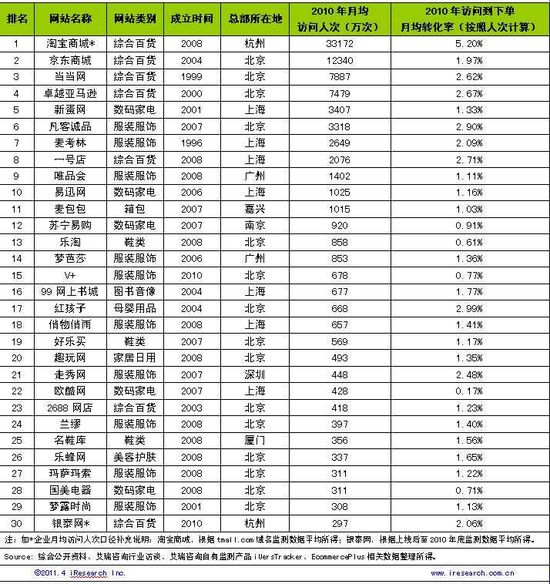 艾瑞发布2010年中国B2C在线零售商Top30榜单