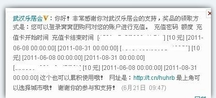 你活动开启后,淘宝上就出现了 10元 20元窝窝团冲值卡。你与微波的新浪微波活动: