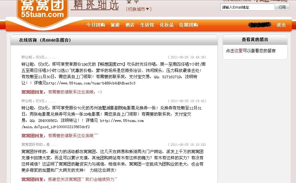 图2:窝窝团官方网站前两天有人表扬窝窝团,说网易和新浪的券是可以累积充值的.当时客服也没说不可以