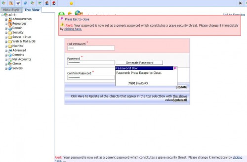 当你第一次登录Kloxo时,系统会自动跳转到密码修改页面并要求你立即修改你的初始密码,不要犹豫,赶紧改吧。如果你觉得自己的密码太弱,那么可以点击“Generate Password”让系统帮你随机生成一组密码。假如你这么做了,请妥善保管自己的密码,忘记密码对于刚刚使用Kloxo的人来说比较麻烦。 建议设置完密码后,在“Administration”模块中的“Information”菜单里设置下你常用的邮箱。如果你忘记Kloxo的密码,通过“找回密码”,系统会随机生成新密码发送到你的邮箱。个人觉得这步设置即重要又方便。如果没有设置邮箱可以通过下面的命令行更改密码: # sh /script/resetpassword master {newpassword} 二:Kloxo中文语言包的安装