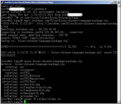 如果你的英文不好,可以为Kloxo安装中文语言包,方法如下: 第一步:使用SSH客户端登录你的服务器并进入Kloxo的语言包目录 # cd /usr/local/lxlabs/kloxo/httpdocs/lang 第二步:下载Kloxo中文语言包 # wget upload/2011/9/201109181532128171.jpg" width="500" height="310" alt="" /> Kloxo会生成各种日志,时间久了就会大量占用硬盘空间,通常会造成MySQL无法启动等问题。通过下面的命令行可以设置服务器每天自动清理Kloxo的日志: # cat > /etc/cron.daily/clean_kloxo_logs.sh << EOF 如果你比较熟悉上面的命令行,你也可以手动删除Kloxo日志。除了Kloxo的日志外,你可以在/var/log目录下找到Linux系统的其他日志。如果你不清楚上述命令行该如何执行,请看我的示例截图。 十、最后 经过初步的基本设置和汉化后,你就可以开始使用Kloxo管理你的服务器和站点了。添加域名、建立数据库等操作都比较简单,网上教程也很多,剩下的靠自己探索啦,有疑问就请教Google大神。操作有风险,折腾需谨慎,请注意数据的备份与安全。建议刚刚入门的同学可以购买一些价廉的VPS作练手用。 |
