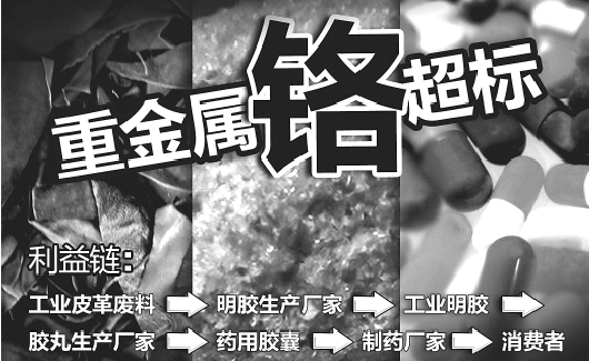 江西省弋阳县龟峰明胶有限公司和河北学洋明胶蛋白厂两家生产厂家,将大量皮革废料,通过添加生石灰等化学办法,进行洗涤加工,做成工业用明胶,然后将部分工业用明胶通过地下秘密的销售链条,销售到全国各地的胶囊生产厂家,我省新昌县是他们的一个主要销售地区。