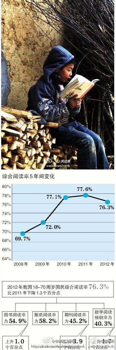 【你的阅读量达到平均数了吗?】去年我国国民人均纸质图书阅读量为4.39本,报纸和期刊阅读量为77.20期和6.56期,电子书阅读量为2.35本。其中,纸质图书阅读量仅比2011年增长不到0.04本,远低于韩国的11本,法国的8.4本,日本的8.5本,美国的7本…53.1%的国民认为自己的阅读量很少或比较少。by@人民日报
