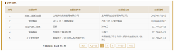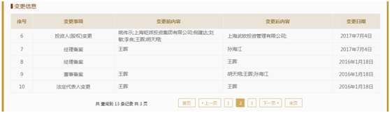 再来看另一个明显涉嫌虚假的信息。钜宝盆在股东情况中披露王晖是董事、总经理,持股10%。但是投资有道记者通过查询最新的工商信息发现,王晖通过上海翼勋企业管理有限公司(翼勋企业)间接持有钜宝盆5%的股份,不是10%,而且在2017年7月4日的工商变更中他已经丧失了翼勋互金的法人资格和董事席位,8月14日,翼勋互金再次进行了工商变更,孙海江仍然是该公司唯一的董事。