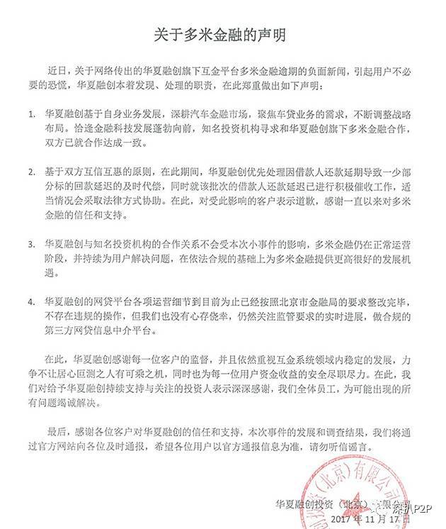 11月17日也就是华夏融创信息修改的第二天。官方网站发布关于关于多米金融的声明: