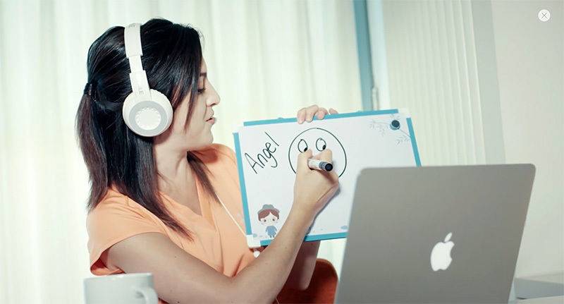 视频对面,外教没有对浩浩的反常举动表示惊讶,始终用很慢的语速热情引导着浩浩开口。当男孩在 iPad 上把单词和图像正确连线后,外教伸出大拇指,用夸张的语调说了句「Very good」。