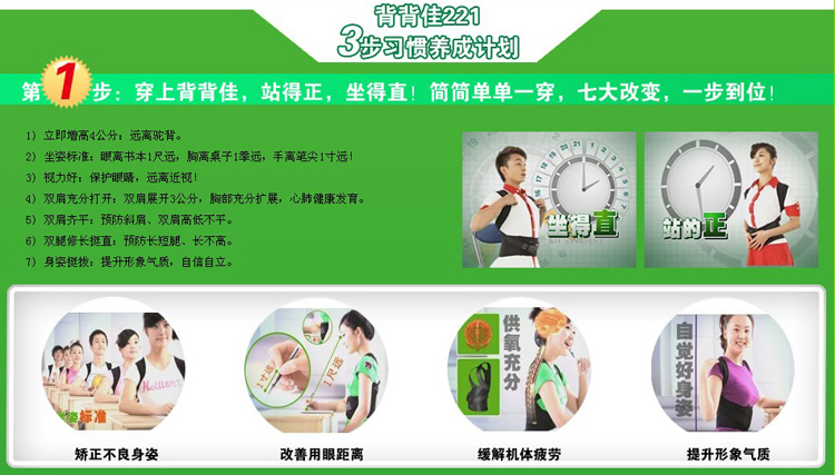 | ★矫正不良身姿----可通过改变不良的坐立行走姿势,养成良好的习惯,辅助维持脊柱正常的生理曲线,保护脊柱。 ★改善用眼距离----改善因不良姿势养成的近距离用眼习惯,保持合理的用眼距离,减轻视觉疲劳,有助预防近视。 ★缓解机体疲劳----可使机体肩、背、腰、腹部均衡受力,使身体维持自然挺拔,缓解因不良姿势导致的肌肉疲劳。 ★提升形象气质----养成抬头挺胸、收腹直腰的好习惯,有助于提升形象气质,促进青少年骨骼的健康生长发育。 |