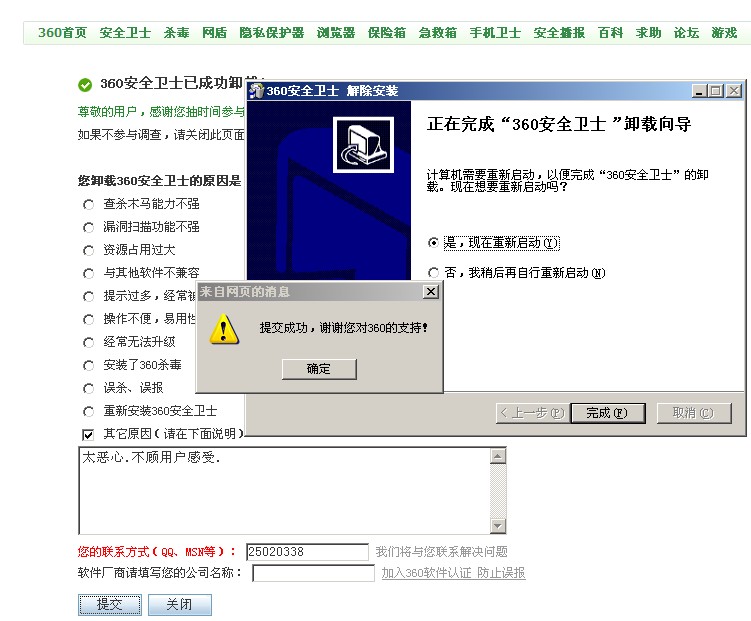 这两天,360和QQ之间的恶意竞争实在太恶心.完全不顾用户感受.不像大公司所为,像小屁孩吵架.于是想卸载掉一个,没办法只能卸掉360,倒不是因为要支持QQ.只是360留着没什么用,QQ有用.
