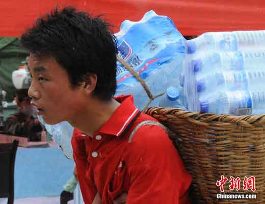 8月12日,甘肃舟曲泥石流灾区,舟曲第三中学的一名志愿者为救援人员送水。中新社发 曹多然 摄