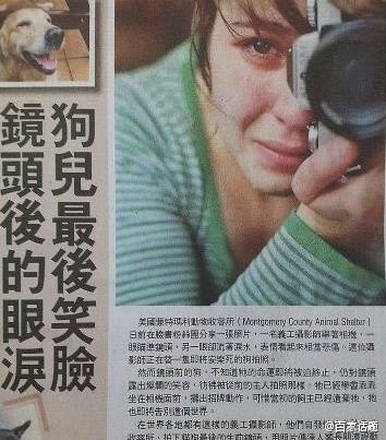 在美国动物收容所内,一名义工摄影师举着相机,流著泪,在替一个即将安乐死的狗狗拍照。然而镜头前的狗,不知道自己的生命即将被迫终止,于是面对镜头仍露出了灿烂的笑容。。。兽医说:“真正的悲剧并不是替他们执行‘安乐死’,而是我们除此之外别无选择"。。。
