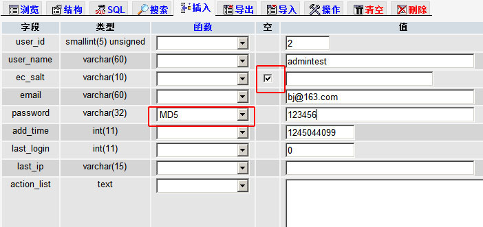 2、password这一行,函数选择 MD5 , 然后在后面的输入框里输入你想要的新密码(如:12345) 即可。