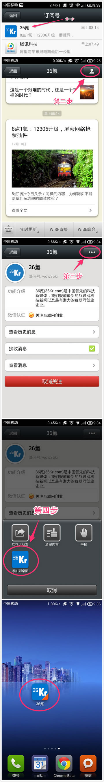 除了搜索或通过订阅号进入之外,Android 版微信还提供了将公众号保存到桌面功能,可按以下步骤操作: