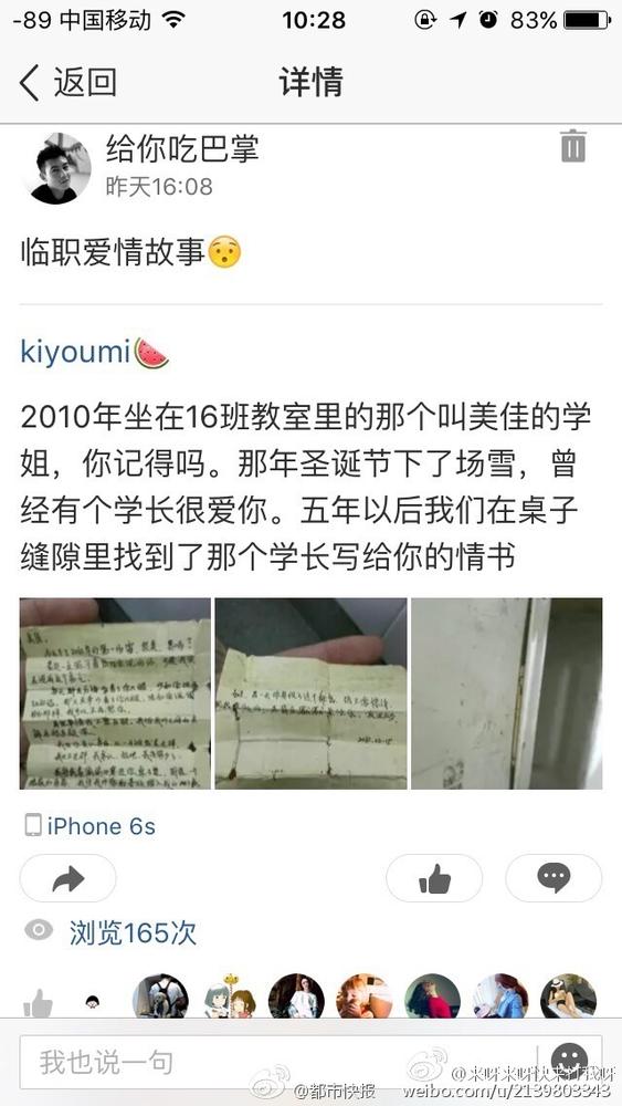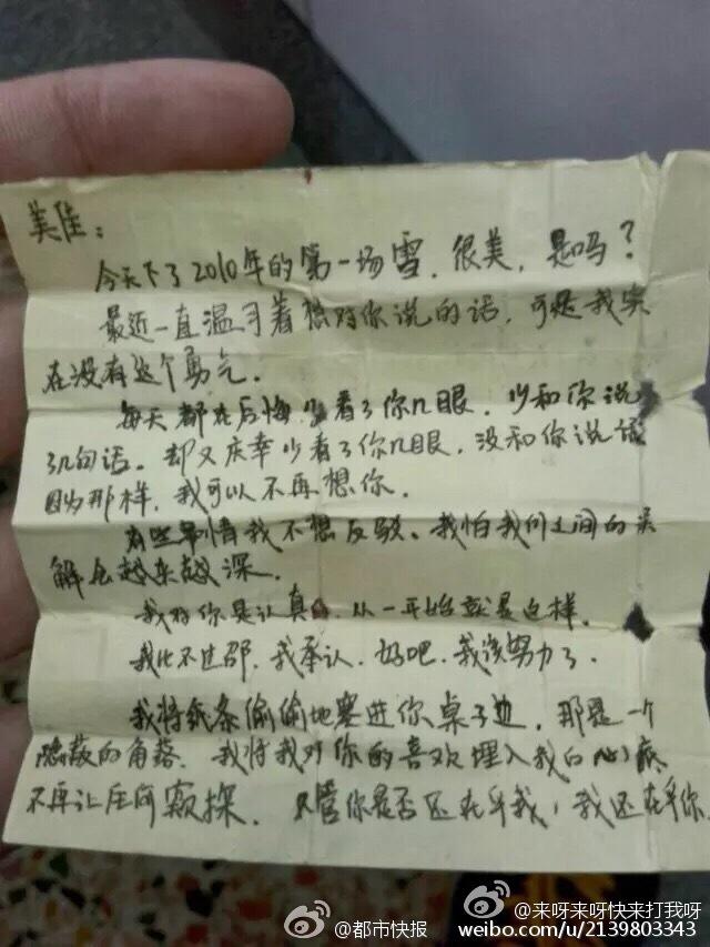 昨天网友“来呀来呀快来打我呀”发了一条微博,说的是他的学妹于无意间在教室桌子的缝隙里,发现了一封情书——情书是一个男生在2010年写给一个叫“美佳”的人。泛黄、破损的纸张,让我们看到了那个曾经的他执着的心意,也触动了多少人的内心。一封多年前的情书,就如同收藏了一段青春的回忆。