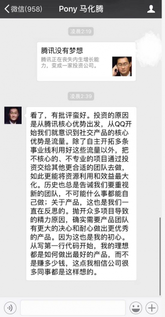 随后,有相关人士曝光了马化腾凌晨2点多对于上述文章评论的微信截图。马化腾表示,有批评蛮好,投资的原因是从腾讯核心优势出发, 从QQ开始我们就意识到社交产品的核心优势是流量。除了自主开拓多条事业线利用好这些流量以外,把不核心的、不专业的项目通过投资交给其他更合适的团队去做,如此更能将资源利用和效率最大化。