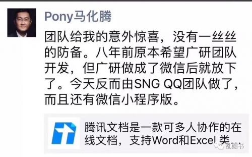 马化腾称,历史也总是告诫我们要重视新的团队,不可能什么事都能自己做;关于产品,这也是我们一直在反思的,确实需要产品团队有更大的决心和耐心做出更优秀的产品。因为这也是我的初心。