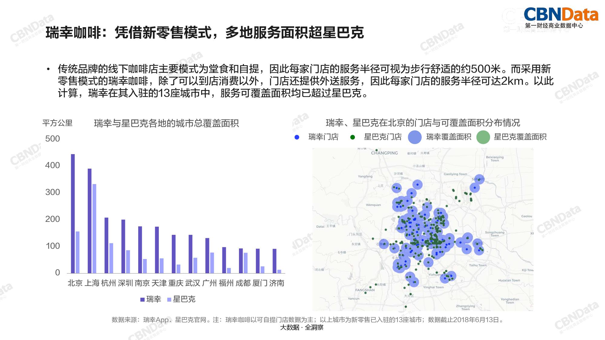 在半年多的时间内,瑞幸咖啡已入驻13座城市,开设门店五百多家。通过新零售的模式,瑞幸咖啡将门店的服务半径拓展到2公里左右。如将星巴克的服务半径设定为步行较为舒适的500米,截止今年6月13日,瑞幸在入驻的13座城市中,服务覆盖面积均已超过星巴克。