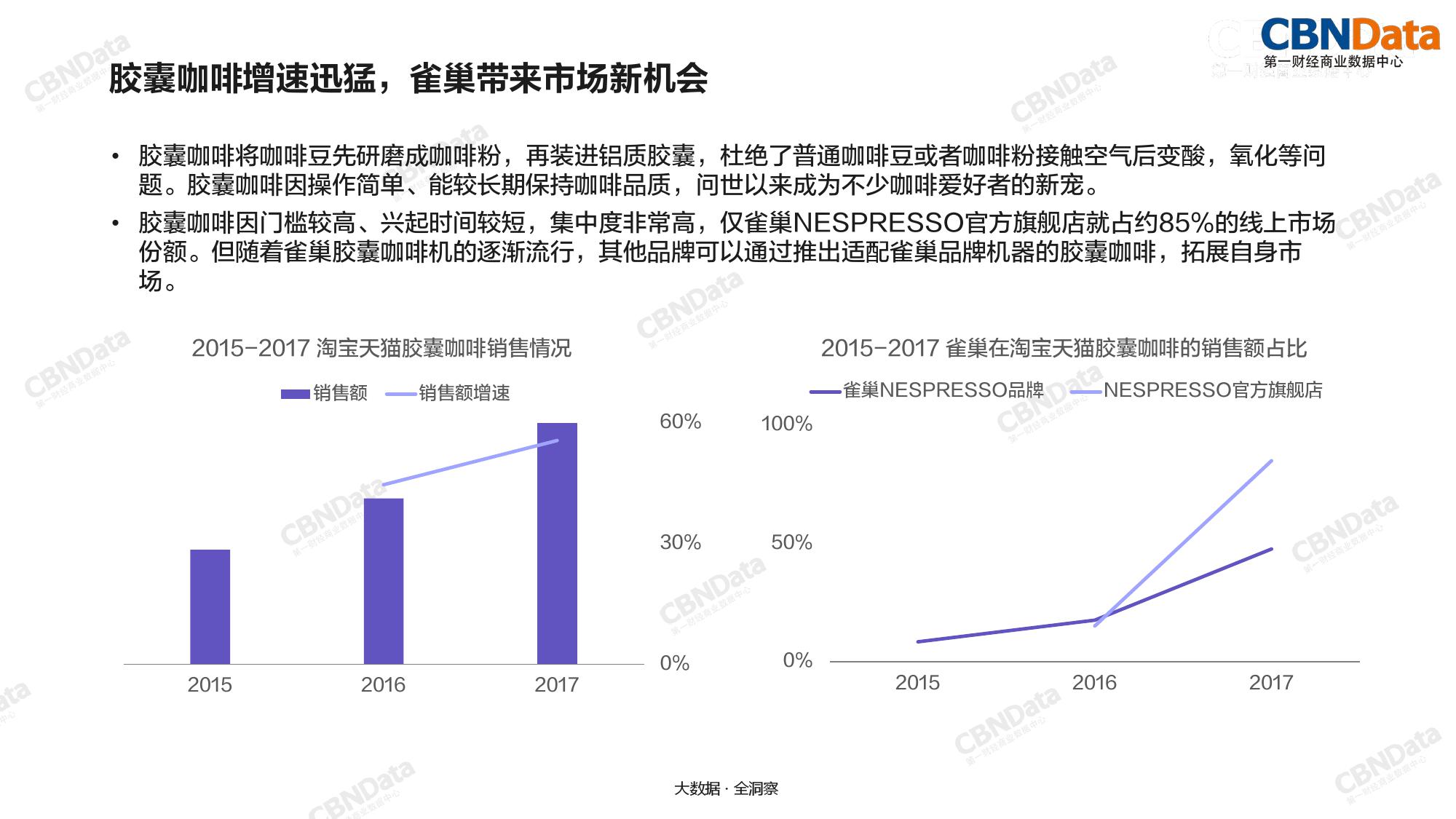 咖啡在家庭场景中普及的一个例证,是胶囊咖啡现在销量的快速增长。目前胶囊咖啡机已经成为“时髦家电”的一员,受到许多家庭的欢迎。胶囊咖啡在过去三年中,已成为线上市场增速最快的咖啡品类,2017年的销售额增速接近60%。