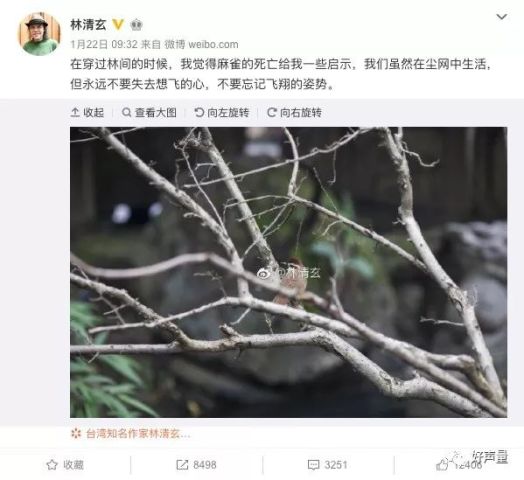 昨天(1月22日)早上,林清玄还发了一条微博,微博的内文就提到了死亡: