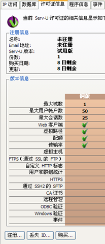Servu好像从8.0开始就开始走web路线了,所有的控制界面都是由html页面所组成的,占用的端口大约是6000多,对于这种软件网站化的趋势我一直不太理解,好多东西如果是本地exe的话,效率什么的都会比web化高很多。但是现在从web迅雷为代表的一系列软件,已经开始web化的尝试。比较常见的有webmsn,webqq,webgtalk什么的。又跑题了,今天说的主角是servu,servu8系列让人觉得很是不适应,完全抛弃了以前的操作习惯和方式。这不,连添个注册码的地方都找不到了。